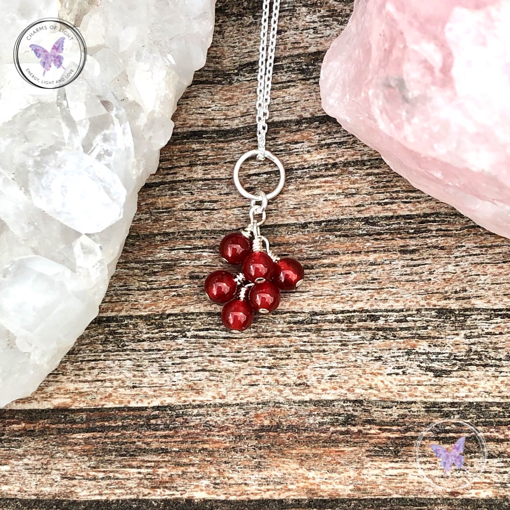 Handwired with sterling silver wire, this stunning crystal cluster pendant is made up of authentic 5mm Myanmar Ruby beads. The pendant is approximately 25mm long from the top of the sterling silver ringbail to the bottom of the sterling silver chainnecklace, and it comes with a sterling silver chain necklace.