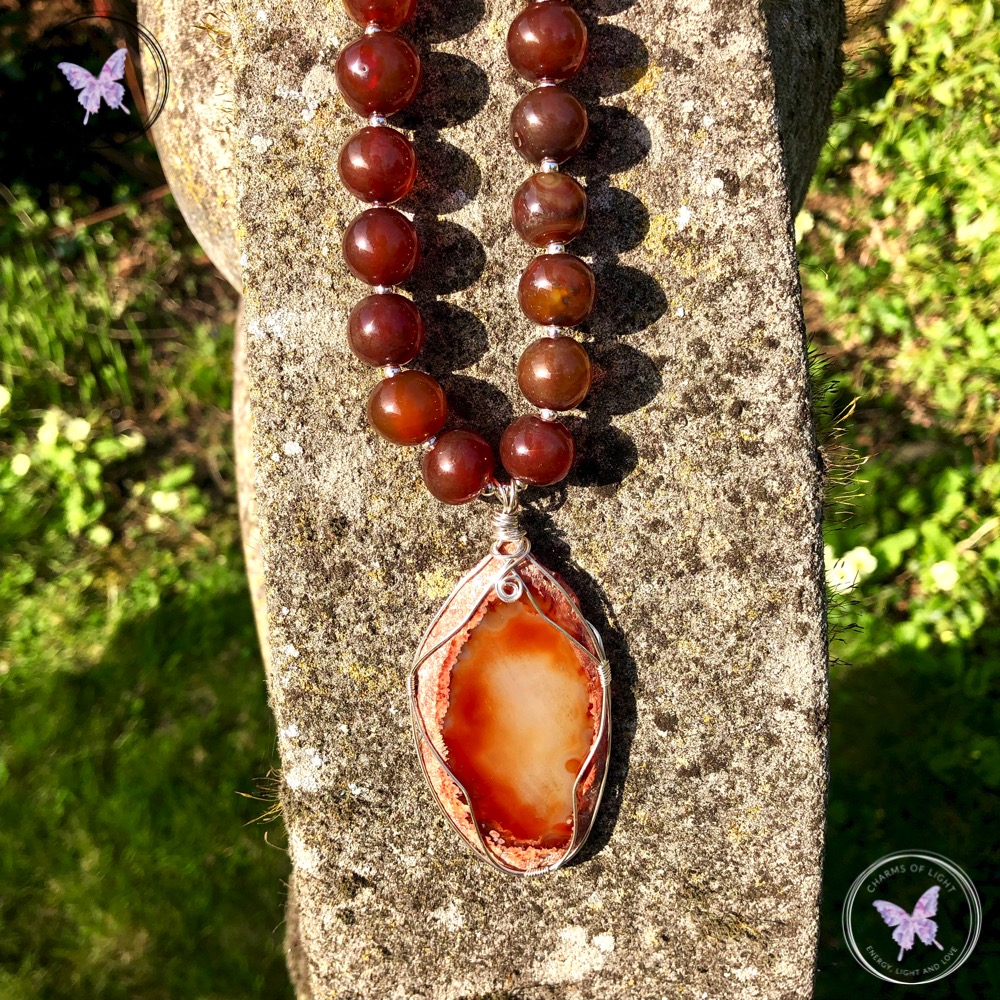 The sterling silverwire-wrapped Agate slice, the 12mm and 10mm round natural Agate gemstone beads, and the 3mm sterling silver beads make up this stunning long necklace. The pendant has a sterling silver carabiner clasp and is approximately 57cm long from the top of the sterling silver wire bail to the bottom of the pendant.