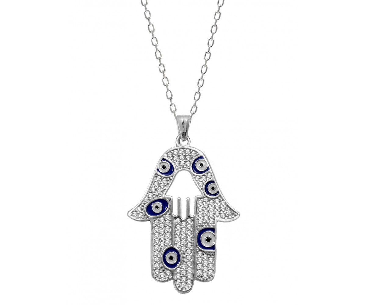 A sterling silver pendant in the shape of the Hamsa hand, often featuring an eye or other protective symbols. The Hamsa hand is a protective amulet in Judaism and Islam, believed to ward off the evil eye. A unique and culturally significant piece of jewelry, often seen as a symbol of protection.