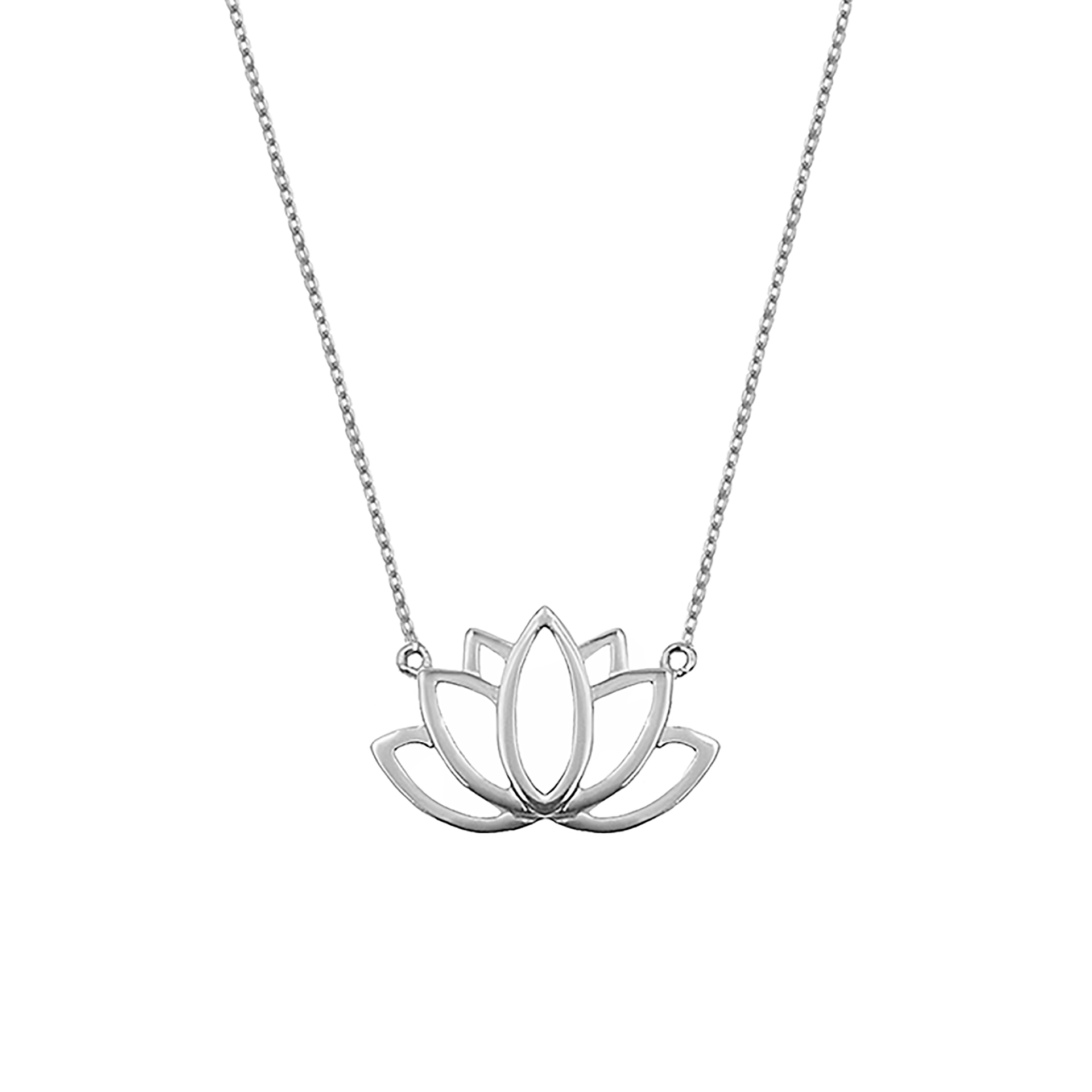 A sterling silver necklace with a lotus flower pendant. In Buddhism, the lotus symbolizes purity, enlightenment, and spiritual growth. A beautifully detailed piece with a serene and meaningful design.