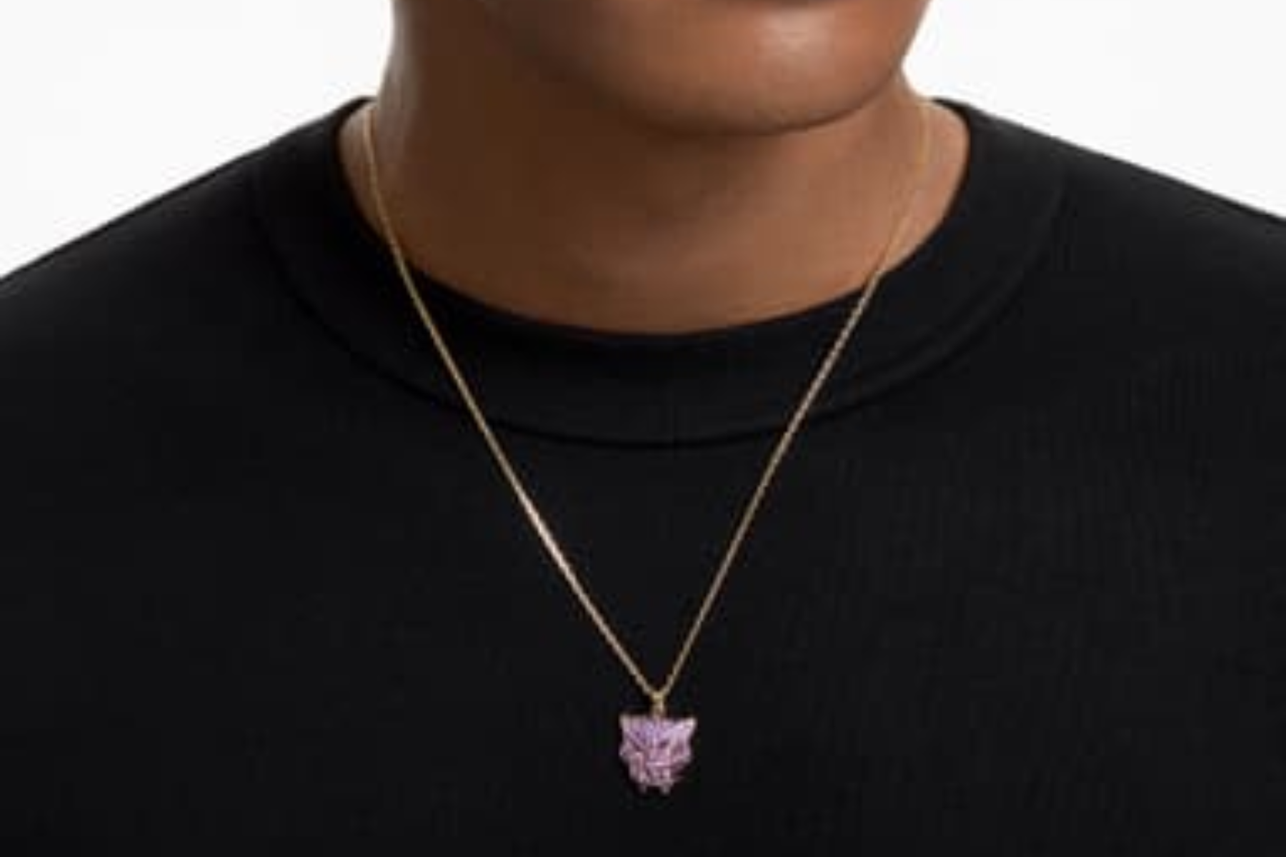 These pieces include a colorful motif ring, a 3D pendant on a long chain, and a mask-shaped pendant with purple crystals.