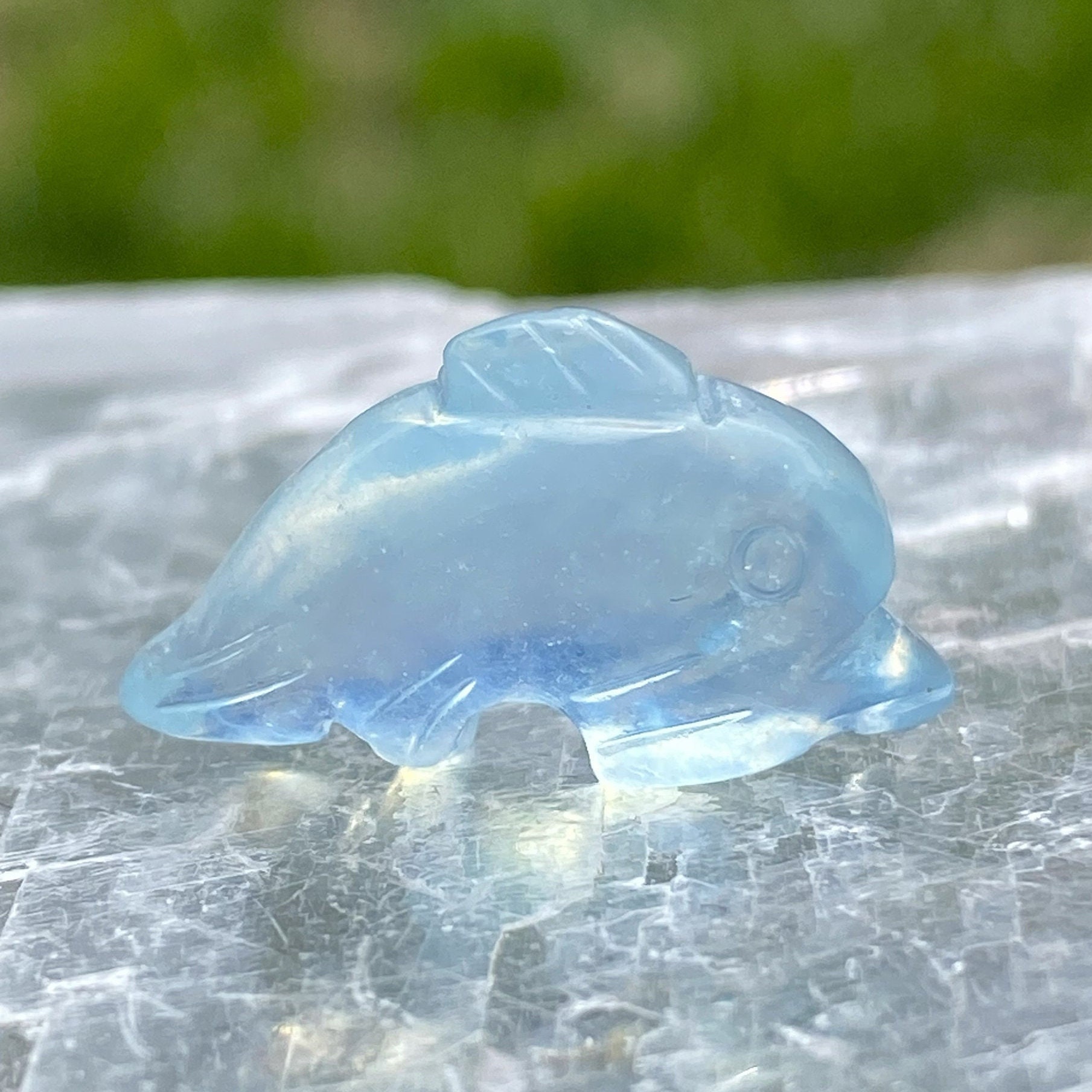 The playful energy of the dolphin meets the calming properties of aquamarine in a gemstone animal totem that symbolizes harmony and communication.