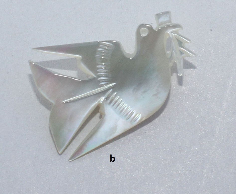Mother-of-pearl, with its iridescent shimmer, is a material often used for gemstone carvings. When crafted into the form of a dove, it symbolizes peace, purity, and divine guidance. The dove has been a universal symbol of hope and tranquility, making this gemstone carving a cherished representation of these qualities.