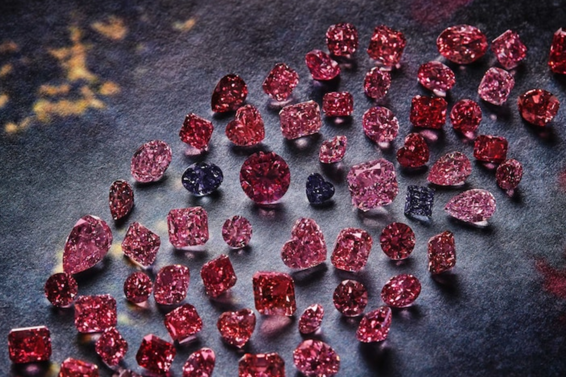 The hoard is known as the "Tiffany Collection," and it contains one fancy red diamond in addition to fancy intense pink, fancy intense purplish-pink, fancy vivid pink, fancy vivid purplish-pink, and deep pink diamonds.